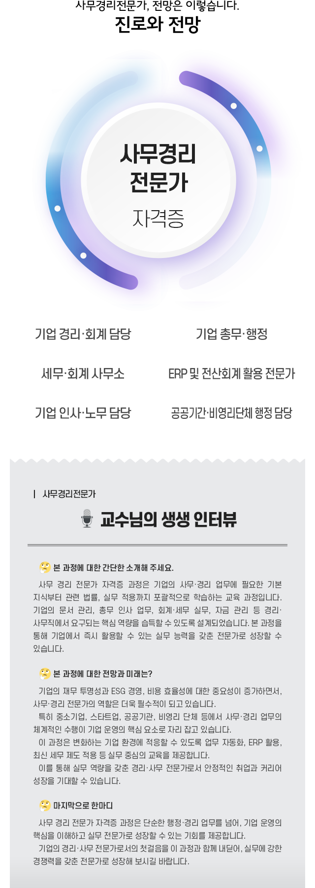 1. ±â¾÷ÀÇ »ç¹«¡¤°æ¸® ¾÷¹« ÇÁ·Î¼¼½º¸¦ ÀÌÇØÇÏ°í ½Ç¹«¿¡¼ ÇÊ¿äÇÑ ÇÙ½É ¿ª·®À» ½ÀµæÇÒ ¼ö ÀÖ´Ù.